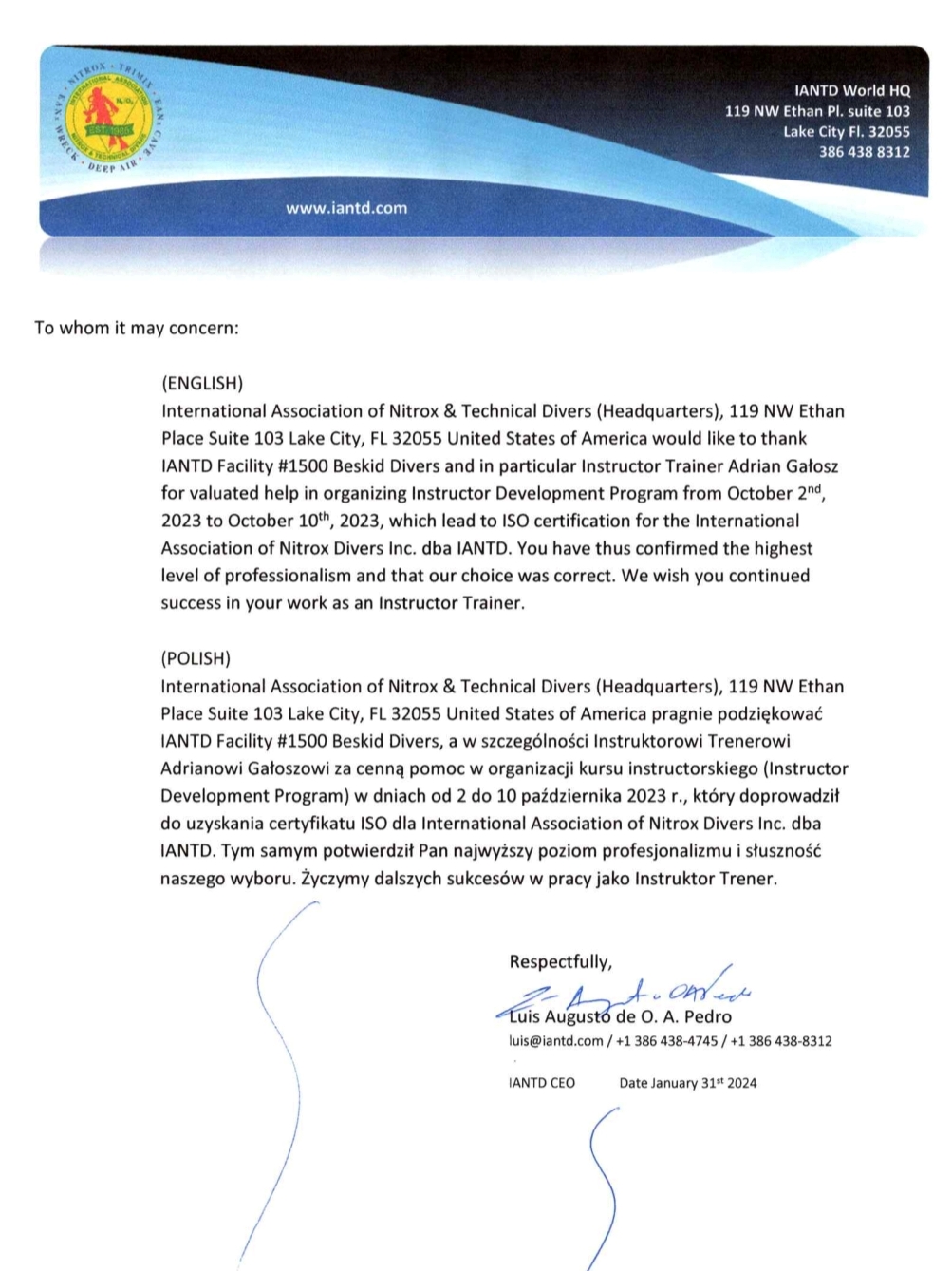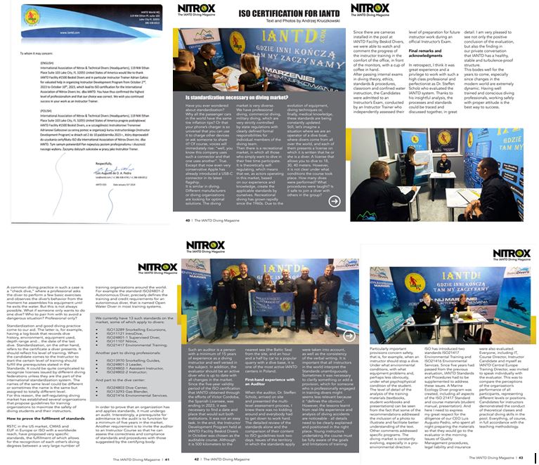 Centrum Nurkowe BeskidDivers Adrian Gałosz przeprowadziło Kursy Instruktorskie, Kursy Nurkowania Rekeracyjnego które doprowadziły do uzyskania certyfikatu ISO dla IANTD International Association of Nitrox & Technical Divers United States of Amercica dla całego Świata !